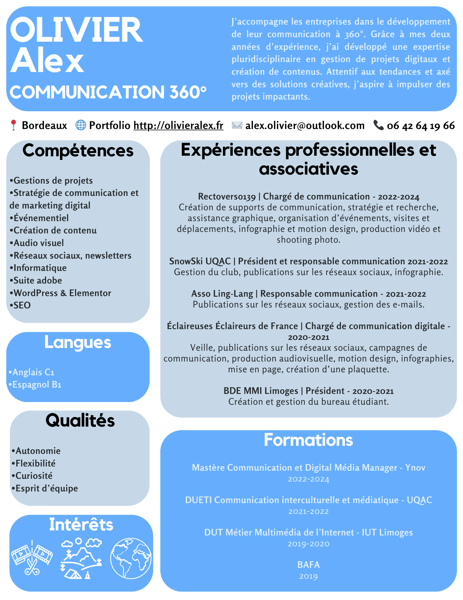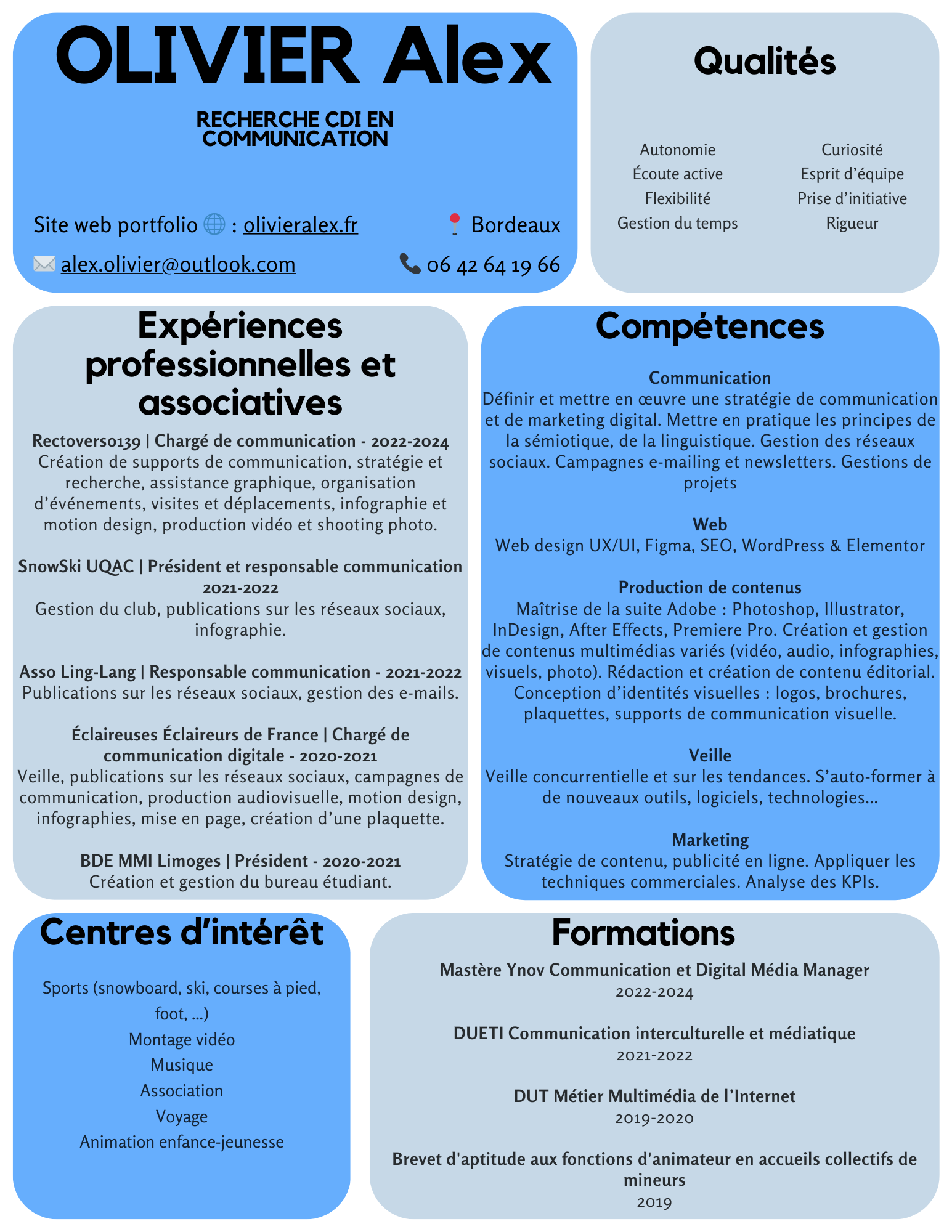 Aujourd’hui, je suis à la recherche d’une nouvelle opportunité professionnelle, idéalement basée à Bordeaux et ses environs, ou en télétravail. Dynamique, curieux et toujours à l’affût des nouvelles tendances, je suis prêt à relever de nouveaux défis pour accompagner les marques dans leur présence digitale.